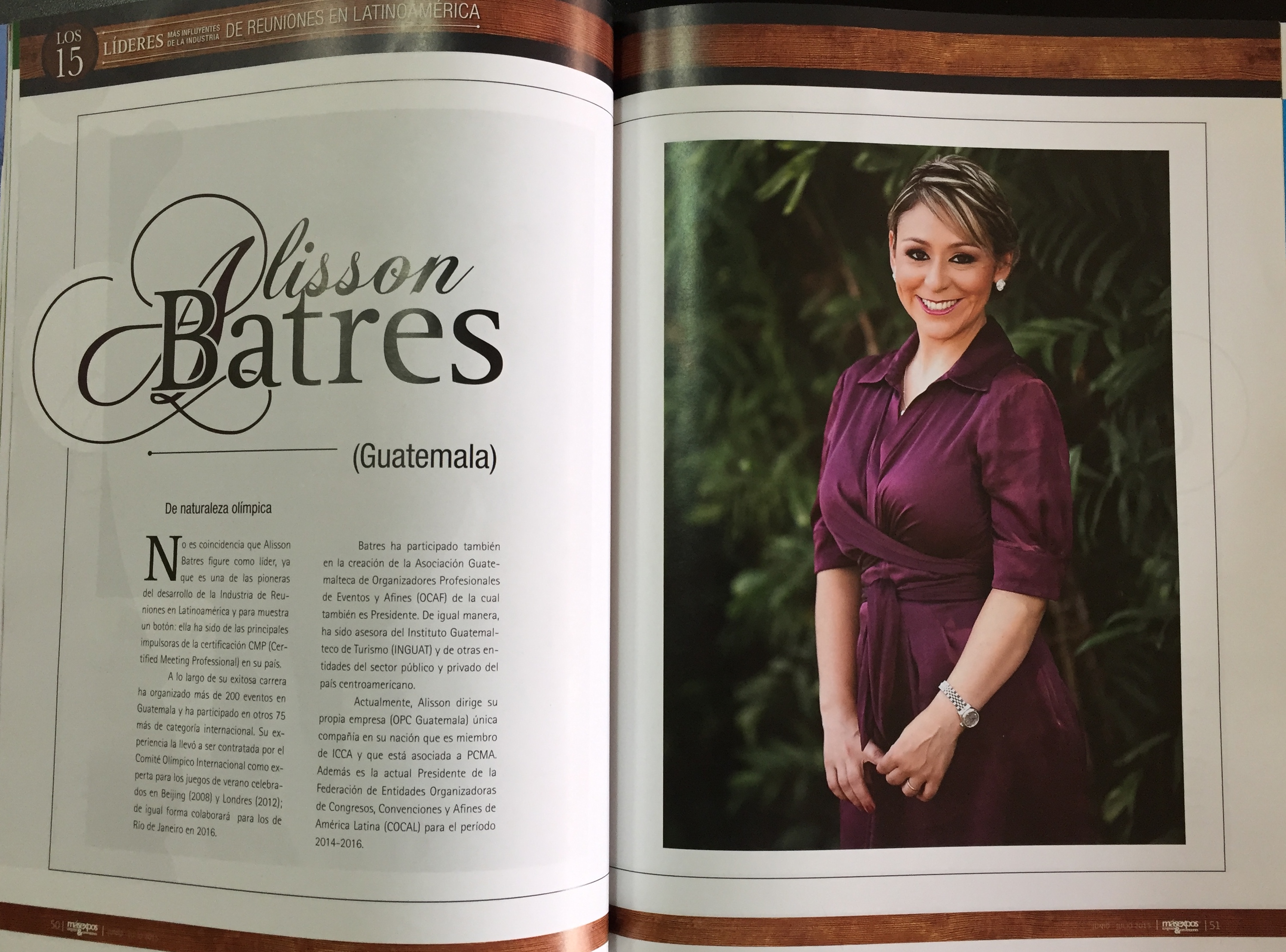 No es coincidencia que Alisson Batres figure como líder, ya que es una de las pioneras del desarrollo de la Industria de Reuniones en Latinoamérica y para muestra un botón: ella ha sido de las principales impulsoras de la certificación CMP (Certified Meeting Professional) en su país.